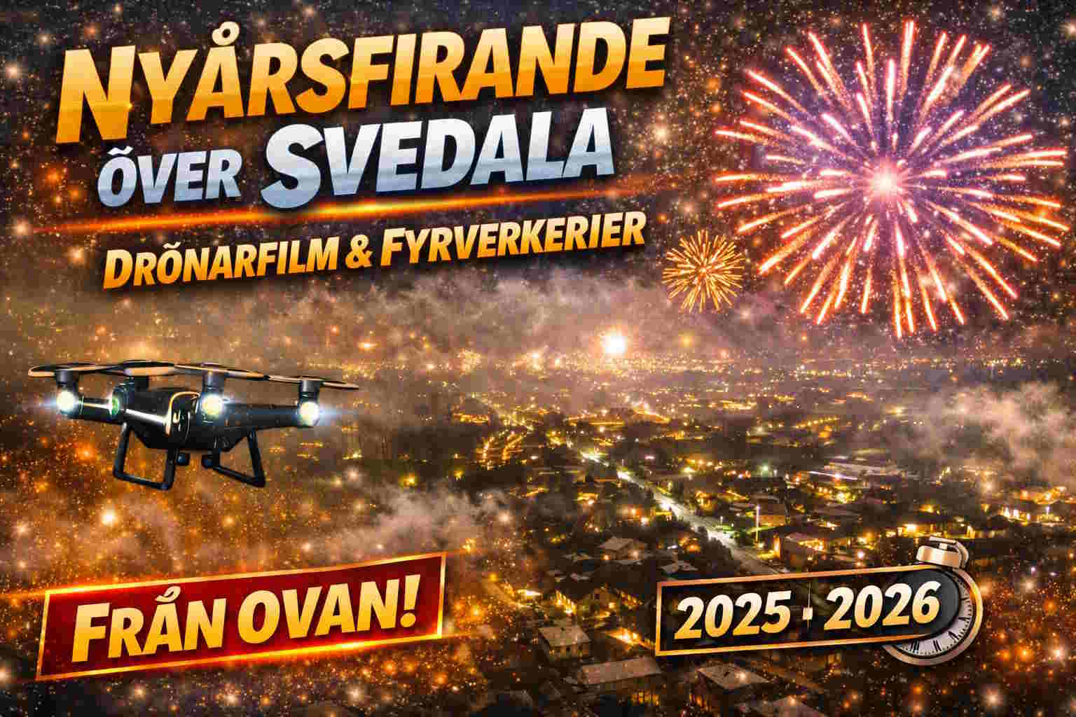 Nattbilder och film tagna över Svedala i samband med nyårsfirandet. Materialet fokuserar på fyrverkerier, stadsmiljö och offentliga platser samt hur ljus, färger och rörelse samspelar över tätorten under årsskiftet. Bilderna är fotograferade i mörker för att fånga nyårsstämning, kontraster och atmosfär sett både från marknivå och från luften.